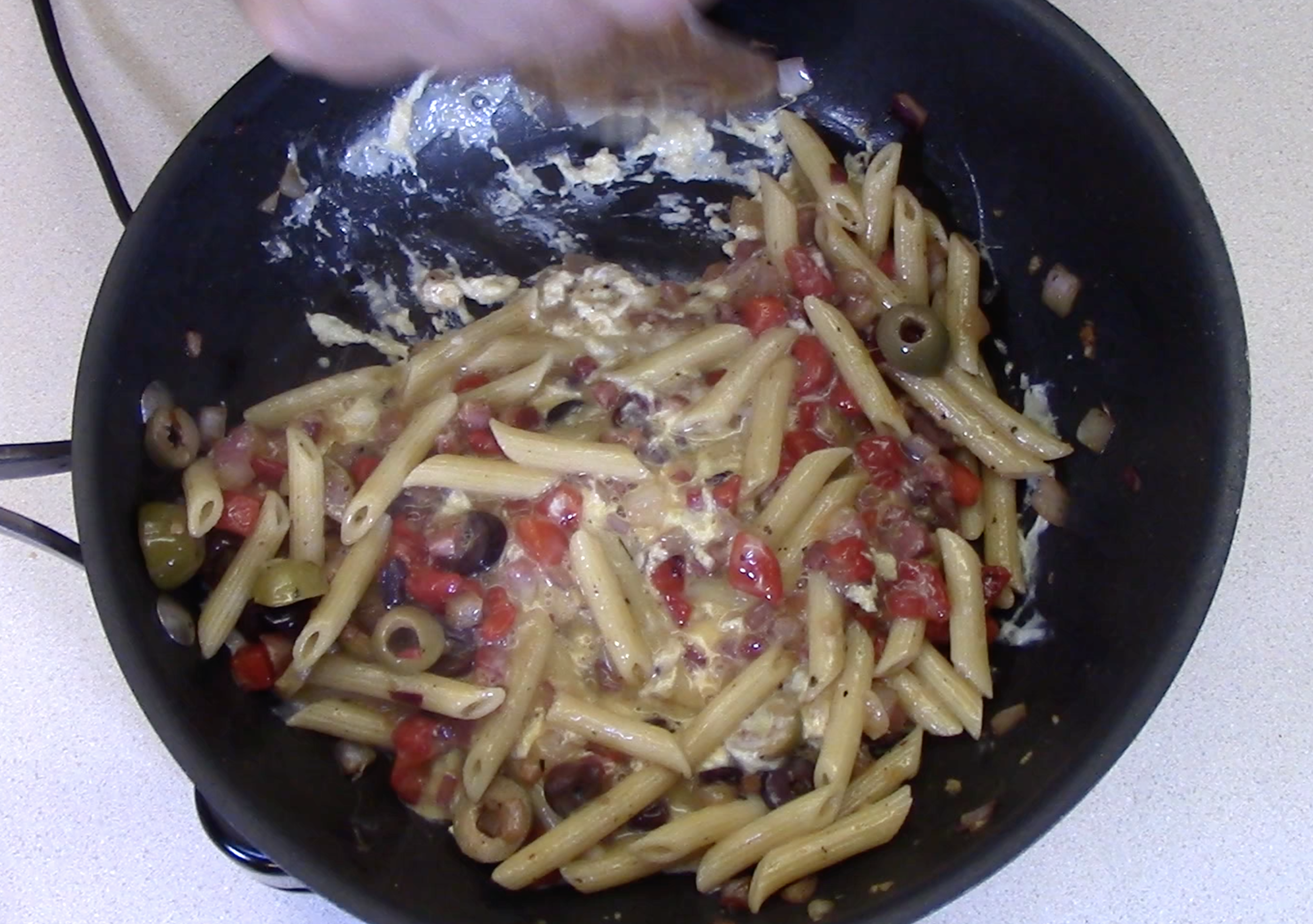 Pasta carbonara is just a spin on Italian stir fry.  As with all stir fry’s the possibilities for ingredients are endless.  The most popular is to use a small amount of bacon (2 oz) or pancetta and render that in the bottom of the pan.  Then the dish always has at least onions and garlic.  You can also add other vegetables like zucchini, summer squash, and mushrooms.  Then feel free to add olives, sun dried tomatoes, and roasted red peppers.  Finish with fresh parsley and top with cheese if desired.