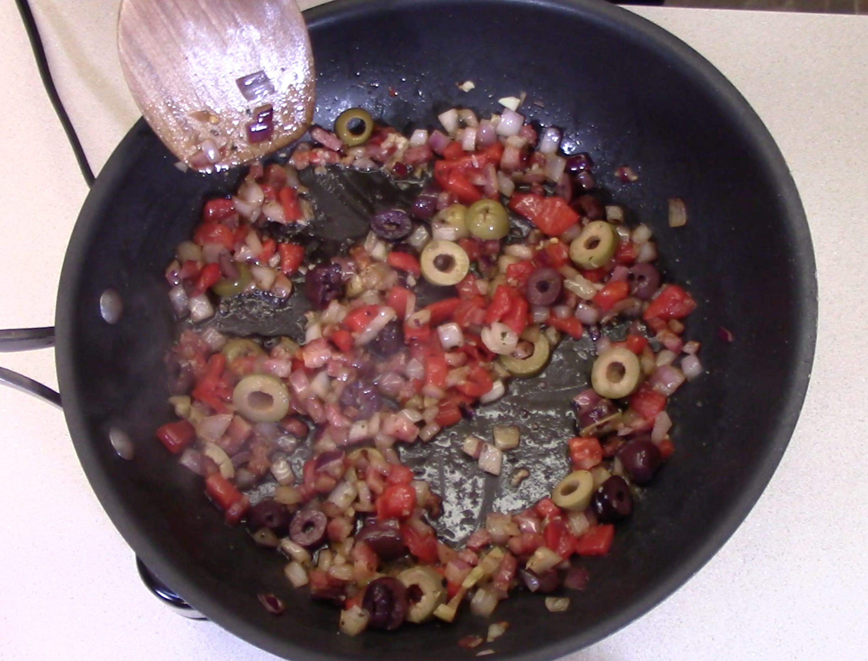 5. Add and olives, peppers, or sun dried peppers and cook until heated through