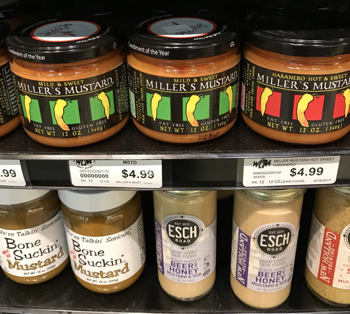 Just a few of the mustards available at WCM. Forget the yellow stuff. Hot dogs just got serious